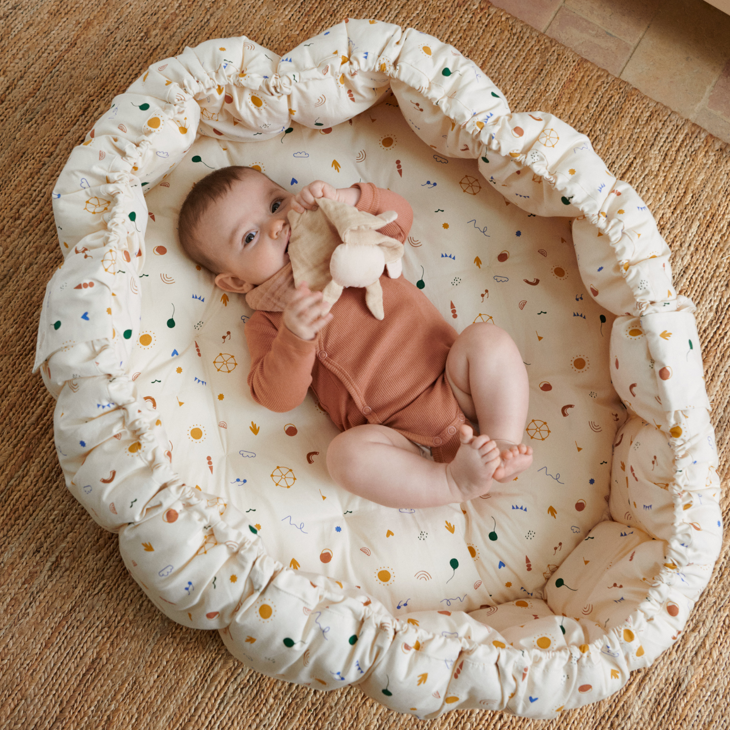 Es handelt sich um eine gepolsterte, meist ovale oder rechteckige Liegefläche mit erhöhten Rändern, die dein Baby beim Schlafen geborgen umhüllt und das Gefühl der Begrenzung im Mutterleib nachahmt. Dies gibt deinem Baby Geborgenheit, Komfort und Sicherheit im Schlaf. Babynestchen sind in der Regel leicht, tragbar und oft mit weichen Materialien wie Baumwolle oder Mikrofaser bezogen.