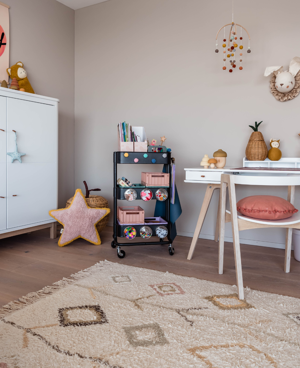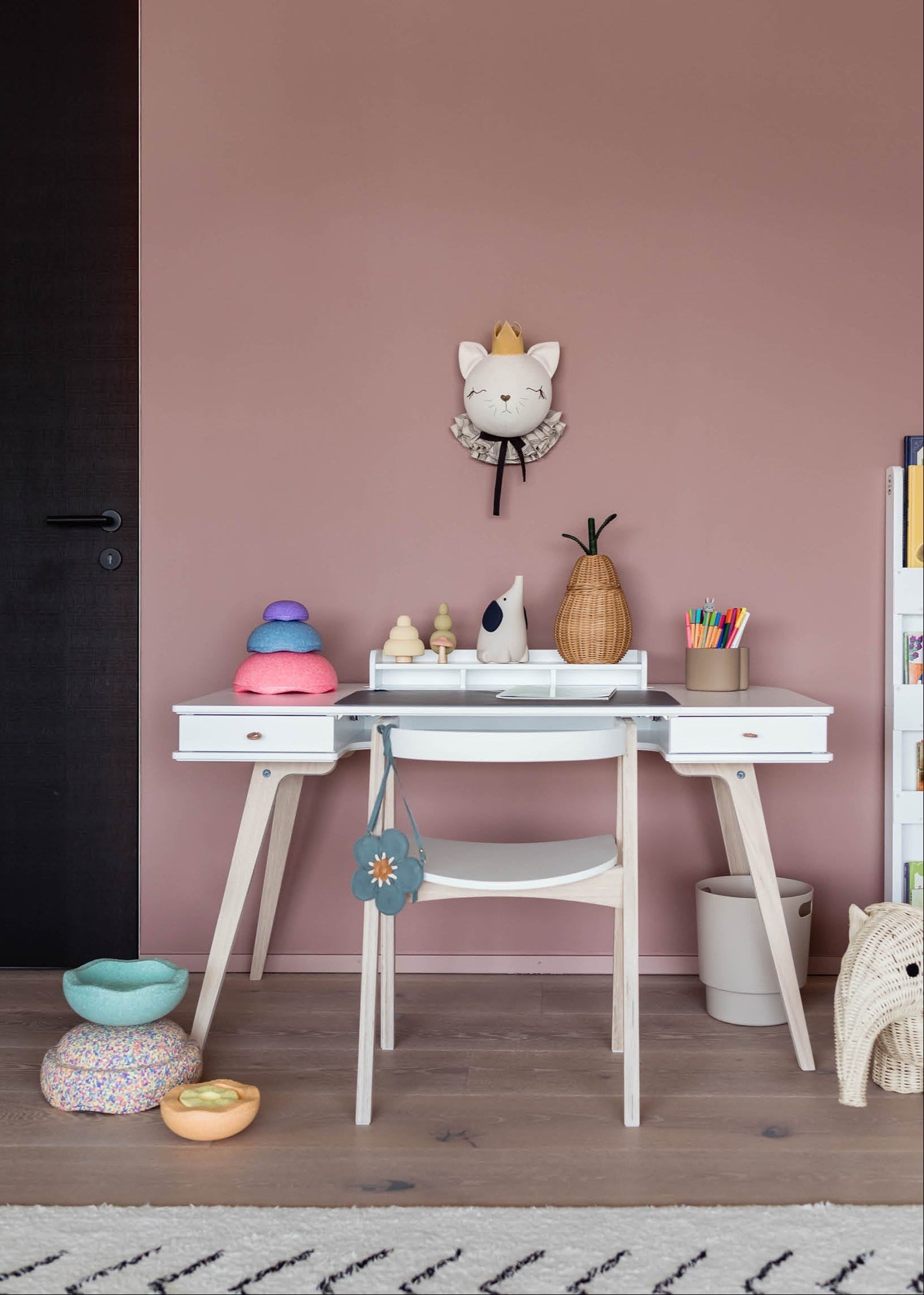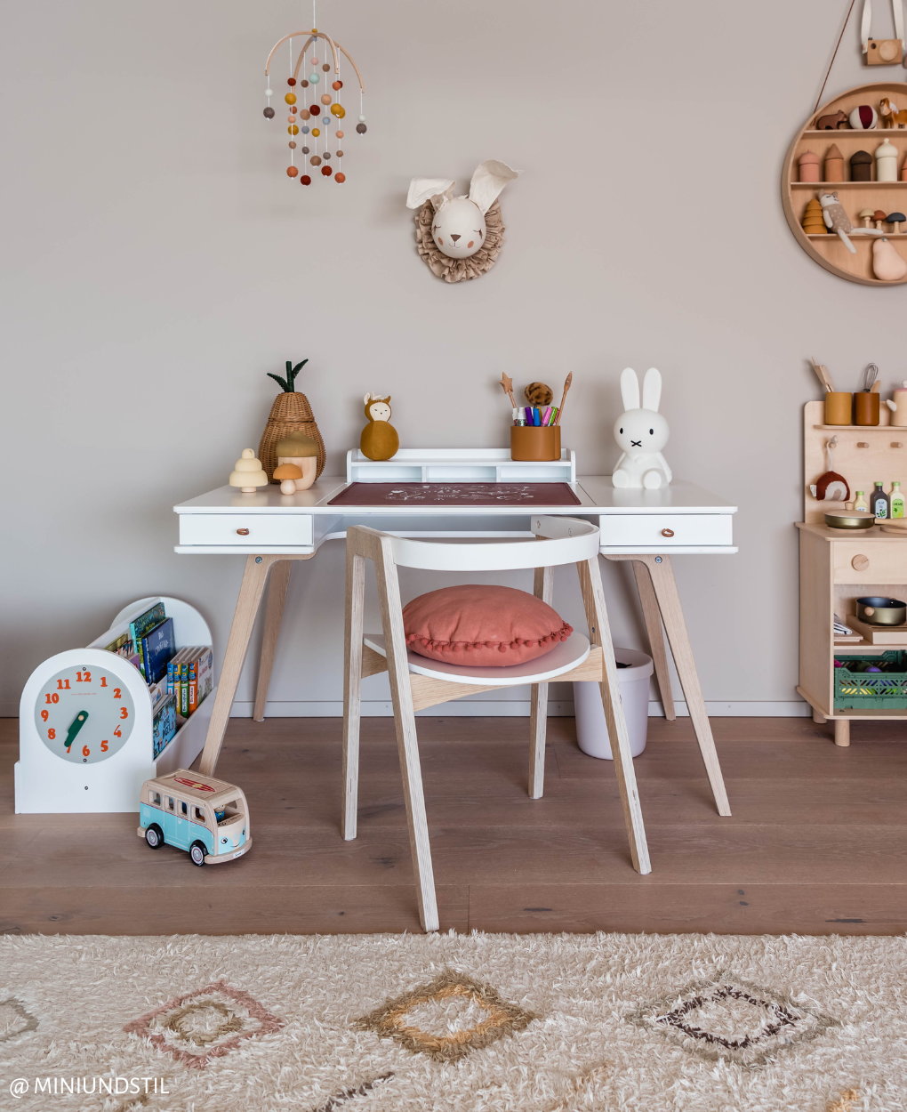 Ein besonderes Merkmal des Kinderschreibtischs K ist seine Funktionalität. Er verfügt über eine grosszügige Arbeitsfläche, auf der Kinder ihre Hausaufgaben erledigen, malen, basteln oder spielen können. Der Schreibtisch bietet genügend Platz für Bücher, Hefte und andere Arbeitsmaterialien und dank aufklappbarer Tischplatte gibt es auf dem Tisch Raum für Kustwerke, Moodboards oder anderem.