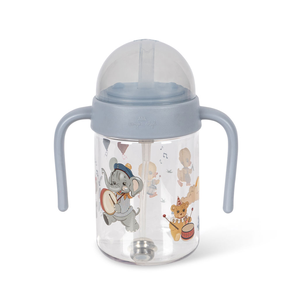 Praktische Babyflasche mit Strohhalm, Henkeln und einem verspielten Tiermuster von Konges Sløjd.