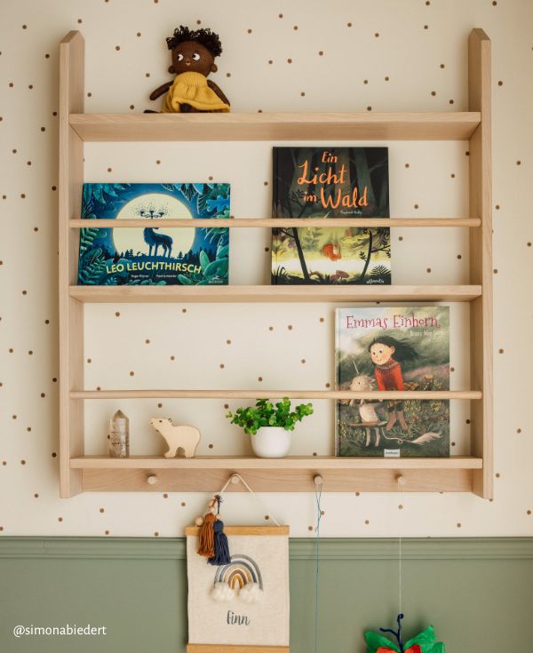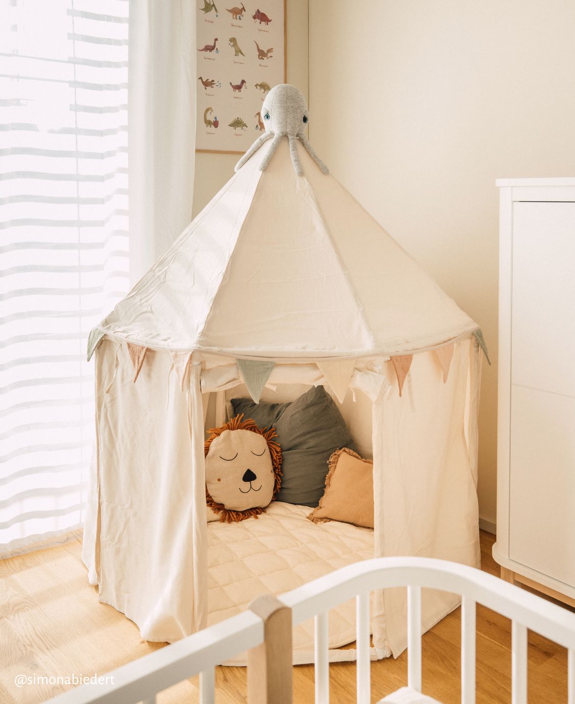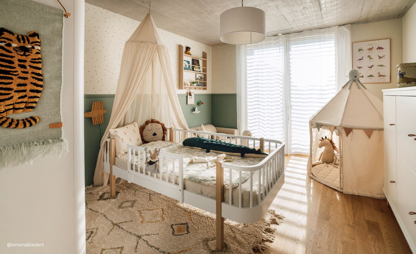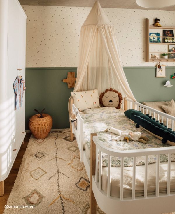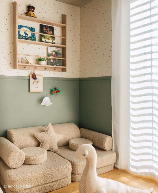 Für Simona und David @davidbiedert durften wir ein Kinderzimmer für ihren Sohn Finn gestalten. Die schöne, gepunktete Tapete von Ferm Living war schon zu Beginn gesetzt. Auch sollte das Kinderbett nach Feng Shui mittig in den Raum integriert sein. Das Bettsofa Wood von Oliver Furniture ist dafür mit seiner hohen Umrandung und mit Rausfallschutz perfekt geeignet. Eine Spielecke und viel Stauraum dürfen im Kinderzimmer natürlich auch nicht fehlen. Herausgekommen ist ein helles & freundliches Kinderzimmer in natürlichen Tönen. Die grüne Wandfarbe Card Room Green von Farrow & Ball strahlt Harmonie im Kinderzimmer aus und kommt mit der Kindertapete von Ferm Living richtig schön zur Geltung. Weiche Textilien und ein Baldachin über dem Kinderbett machen das Kinderzimmer gemütlich. Das Spielzelt von Kids Concept passt hervorragend in die Zimmerecke und bietet einen schönen Rückzugsort. Eine cozy Leseecke mit dem Spielsofa von Wigiwama lädt zum Spielen und Entspannen ein. Wir hoffen Finn gefällt das Zimmer genau so gut wie uns!