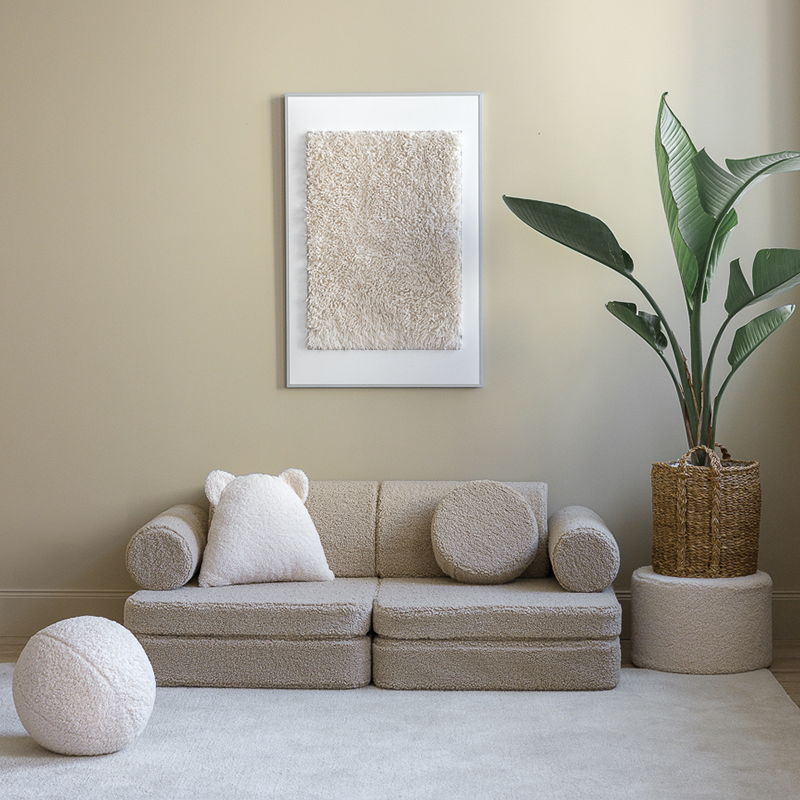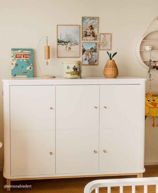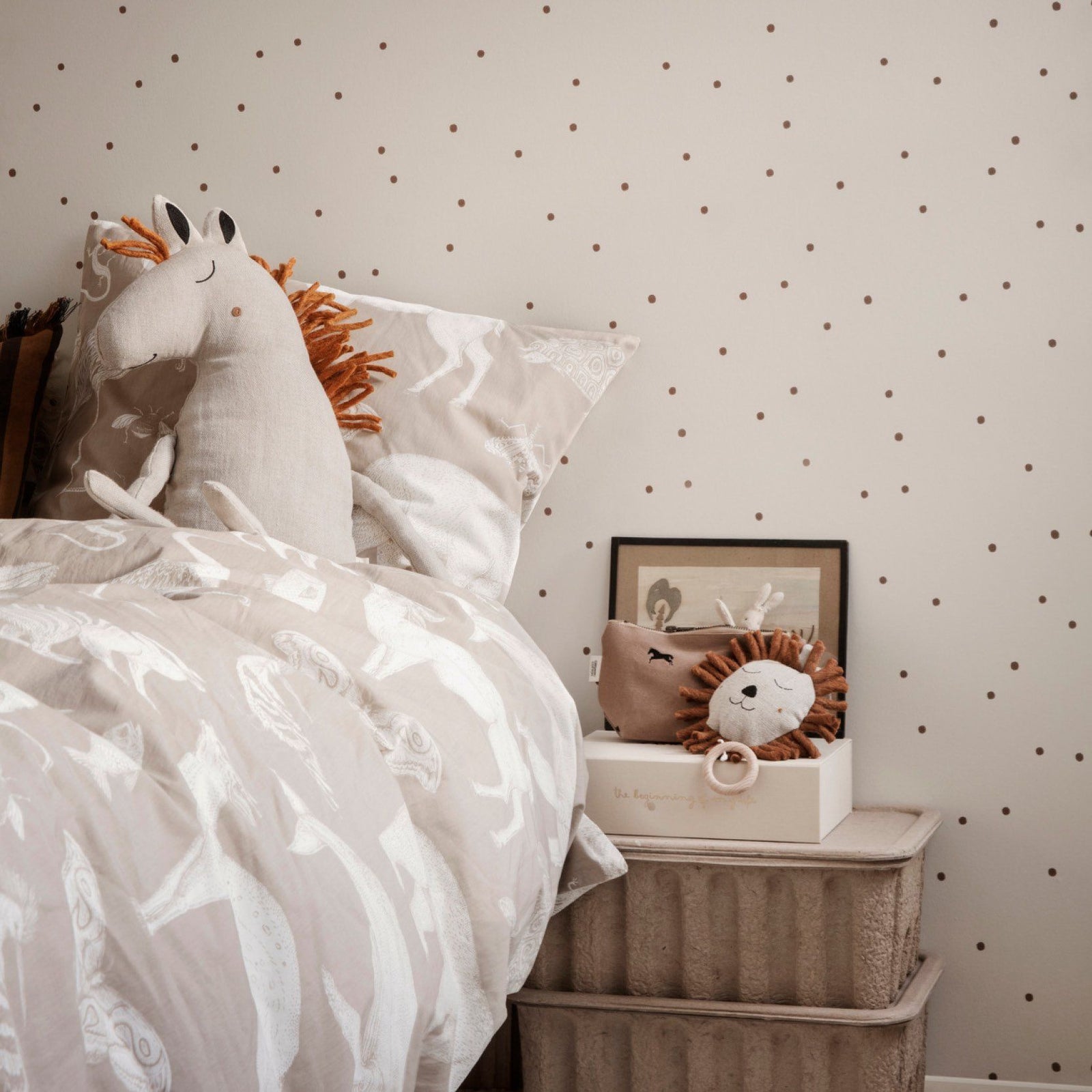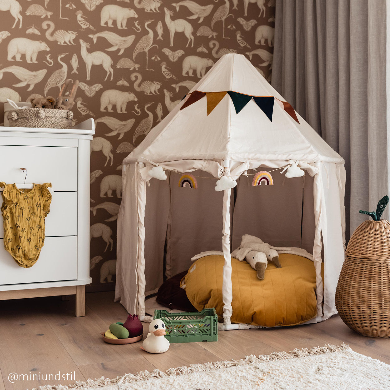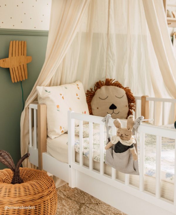 Für Simona und David @davidbiedert durften wir ein Kinderzimmer für ihren Sohn Finn gestalten. Die schöne, gepunktete Tapete von Ferm Living war schon zu Beginn gesetzt. Auch sollte das Kinderbett nach Feng Shui mittig in den Raum integriert sein. Das Bettsofa Wood von Oliver Furniture ist dafür mit seiner hohen Umrandung und mit Rausfallschutz perfekt geeignet. Eine Spielecke und viel Stauraum dürfen im Kinderzimmer natürlich auch nicht fehlen. Herausgekommen ist ein helles & freundliches Kinderzimmer in natürlichen Tönen. Die grüne Wandfarbe Card Room Green von Farrow & Ball strahlt Harmonie im Kinderzimmer aus und kommt mit der Kindertapete von Ferm Living richtig schön zur Geltung. Weiche Textilien und ein Baldachin über dem Kinderbett machen das Kinderzimmer gemütlich. Das Spielzelt von Kids Concept passt hervorragend in die Zimmerecke und bietet einen schönen Rückzugsort. Eine cozy Leseecke mit dem Spielsofa von Wigiwama lädt zum Spielen und Entspannen ein. Wir hoffen Finn gefällt das Zimmer genau so gut wie uns!