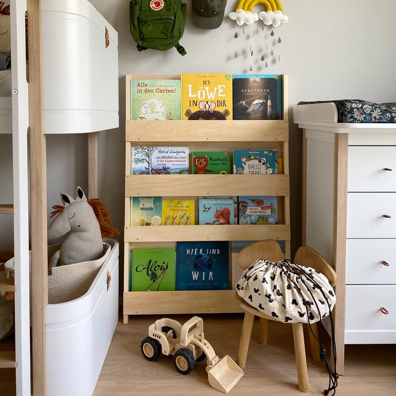 Wichtiges und aktuelles Spielzeug wurde griffbereit in der Bettschublade verstaut. Mit dem Tidy Books Bücherregal und dem gemütlichen Hocker von Wigiwama haben wir den Jungs eine einladende Leseecke geschaffen.