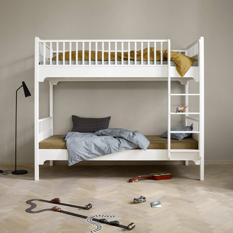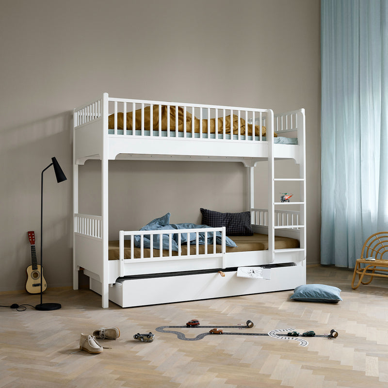 Das Etagenbett aus der Seaside Collection von Oliver Furniture wurde mittig im Zimmer platziert, um als Raumteiler zu dienen. So haben die Kinder die Möglichkeit, sich bei Bedarf in separate Spielbereiche zurückzuziehen.