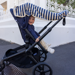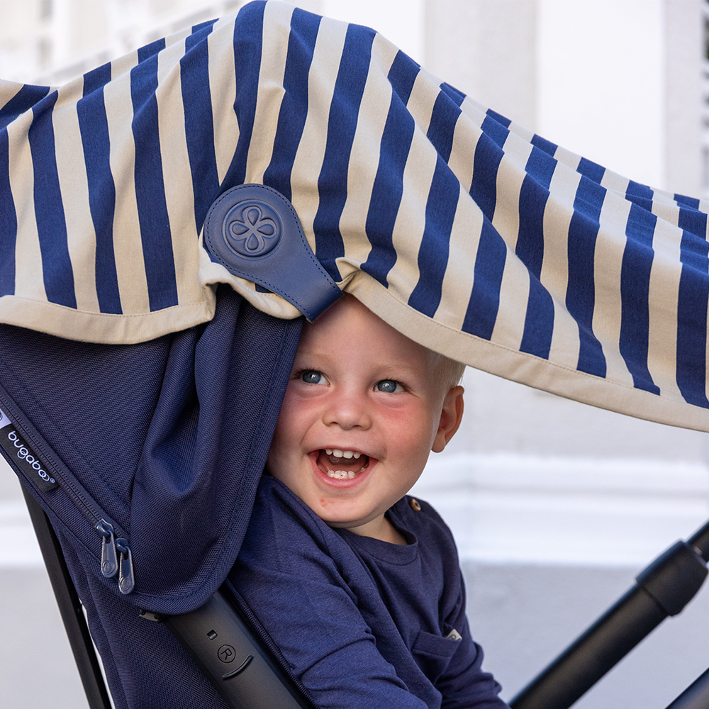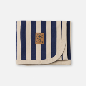Die ultrasofte UV-Decke von Cloby in Navy/Sandy Stripe bietet deinem Kind einen UPF 50+ Schutz.