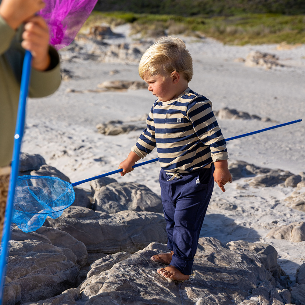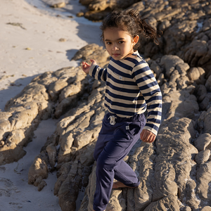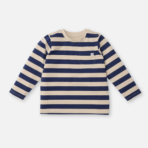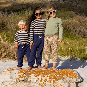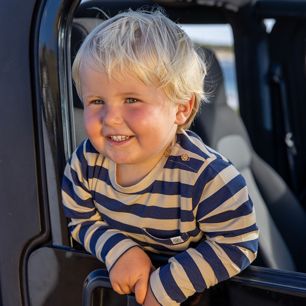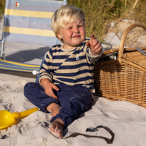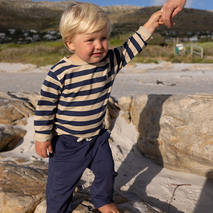 Das weiche und leichte UV-Langarmshirt in Navy/Sandy Stripe von Cloby schützt dein Kleines mit einem natürlichen Sonnenschutz vor UV-Strahlung.