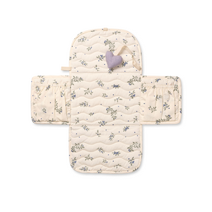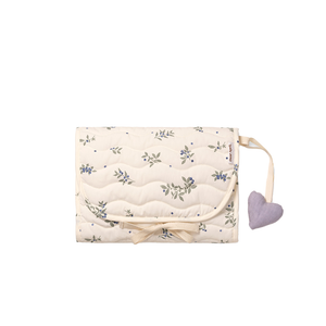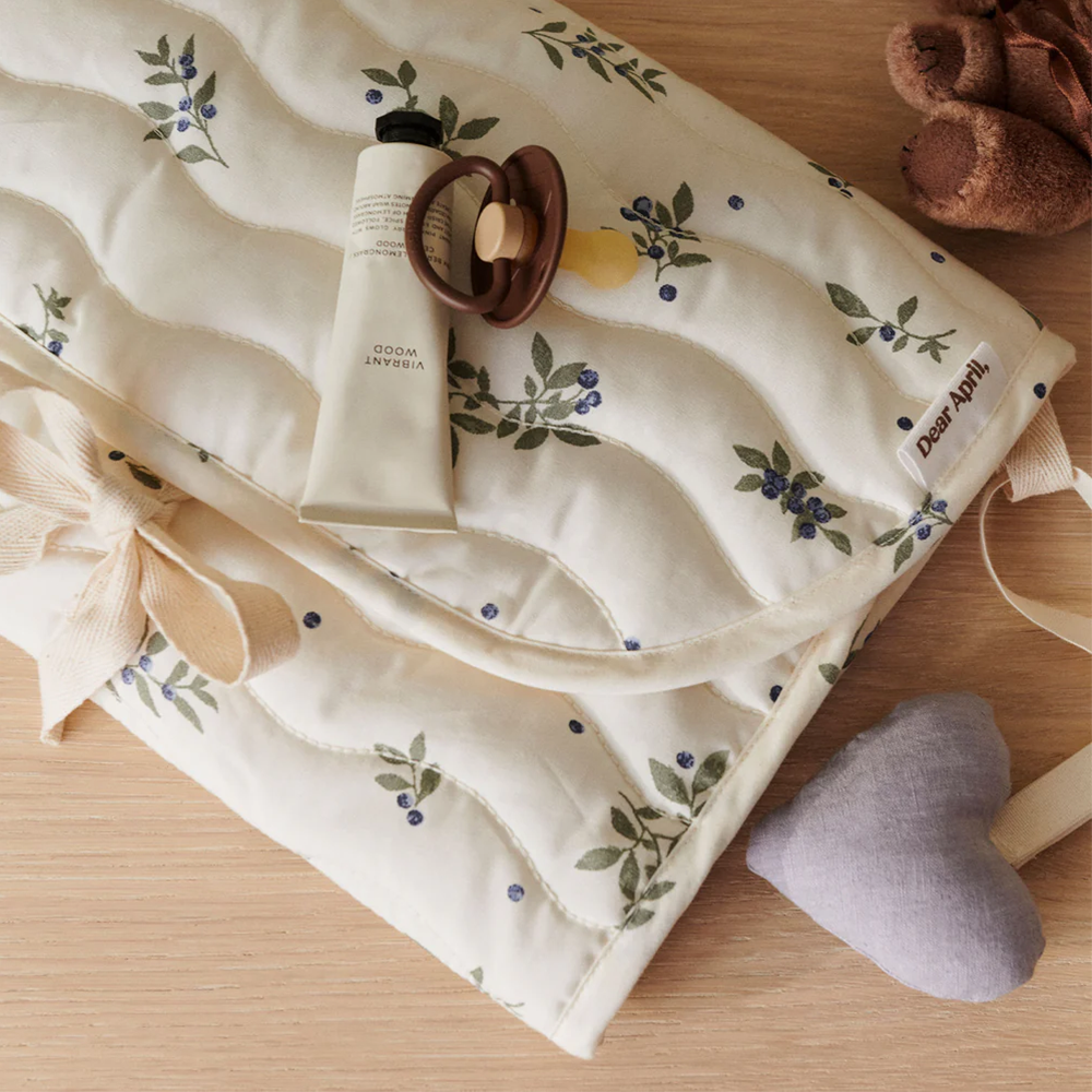 Die weich gepolsterte Wickelunterlage 'River' mit süssem Blaubeerenmuster von Dear April schenkt deinem Baby auch unterwegs einen angenehmen und hygienischen Wickelplatz.