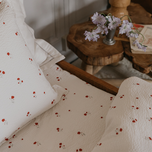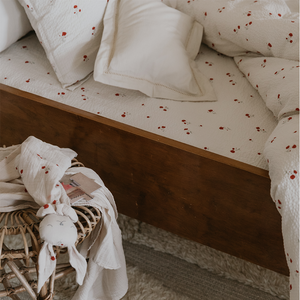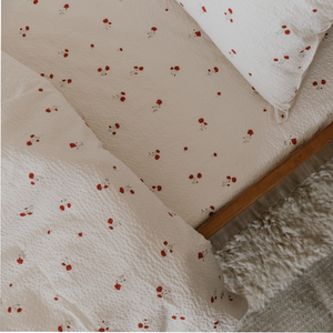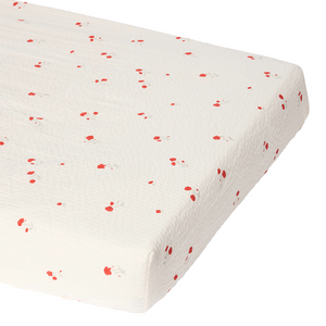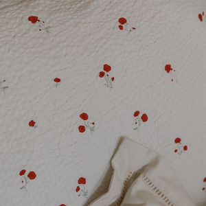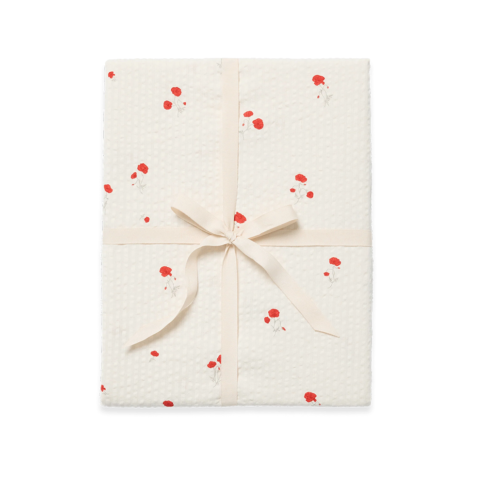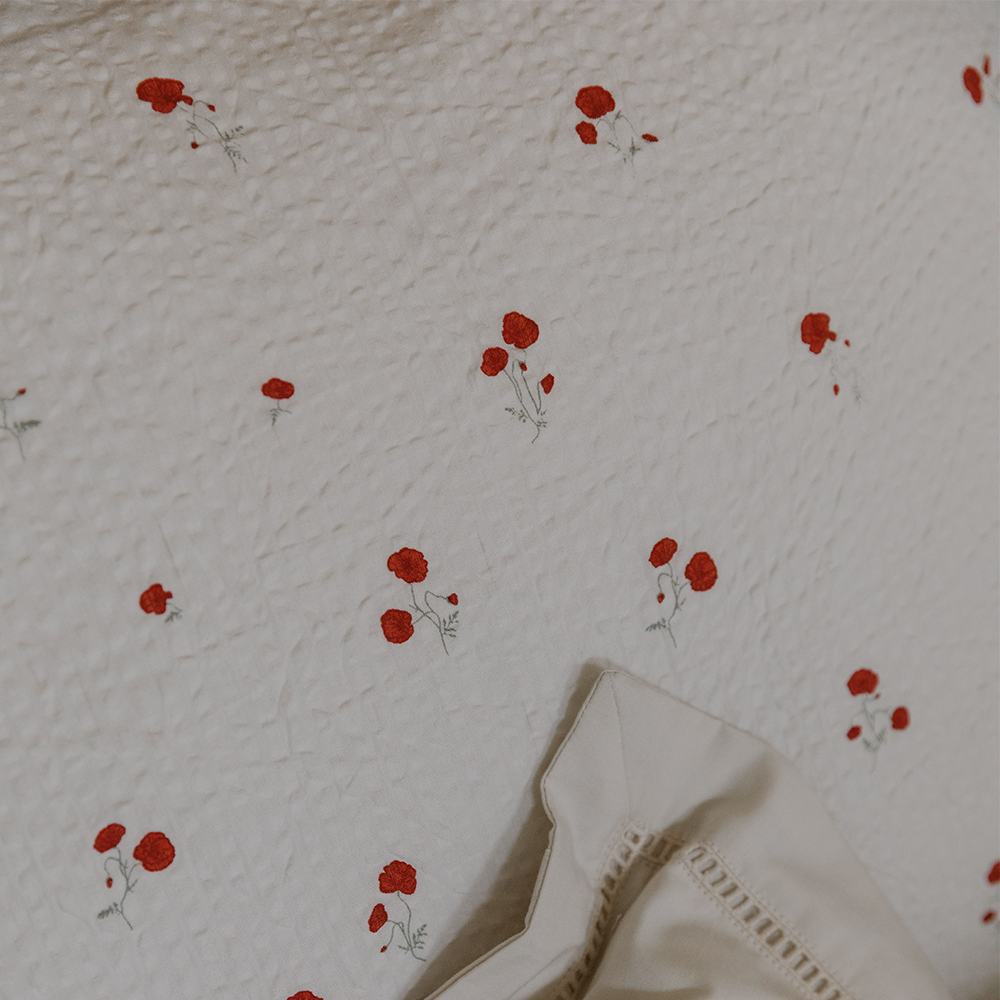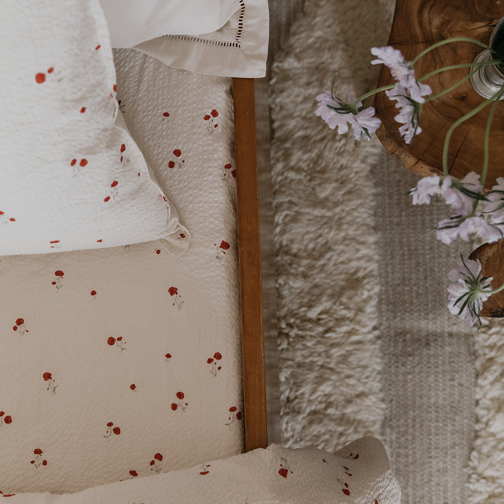 Gemütliches Spannbettlaken 'Poppy' mit zartem Mohnblumenmuster von Garbo & Friends. Das Fixleintuch besteht aus weichem und atmungsaktivem Seersucker-Material aus 100% Bio-Baumwolle. Der elastische Saum des Bettlakens legt sich um die Matratze, ist leicht anzuziehen, bleibt während des Gebrauchs an Ort und Stelle und lässt sich leicht abziehen, wenn es Zeit zum Waschen ist.