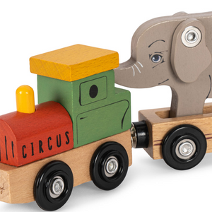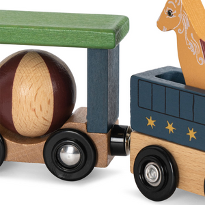 Liebevoll gestalteter Holzzugmit verschiedenen Tieren als Passagiere von Konges Sløjd.