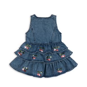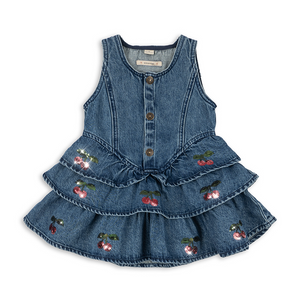 Hübsches Jeanskleid Elba' mit entzückendem Kirschenmuster aus Pailletten vonder Marke Konges Sløjd. Es ist aus 100% weichster Bio-Baumwolle gefertigt und bietet deinem Kleinen einen hohen Tragekomfort. Ob mit einem T-Shirt, einer Bluse oder einem gemütlichen Pullover und Strumpfhosen darunter - das Kleidchen lässt sich wunderbar an verschiedene Anlässe und Jahreszeiten anpassen.