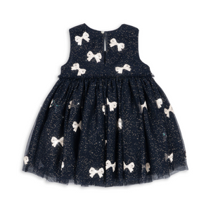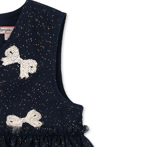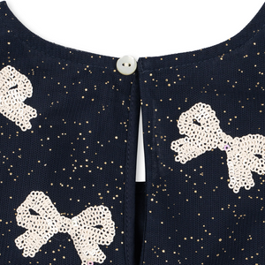 Das wunderschöne Kleid 'Yvonne' von Konges Sløjd mit Schleifchen aus Pailletten und schimmerndem Material ist perfekt für ganz besondere Anlässe. Das Kleid besitzt einen voluminösen Rockteil, mit dem es sich perfekt Pirouetten drehen lässt und ein weiches Futter aus Baumwolle für einen hohen Tragekomfort.