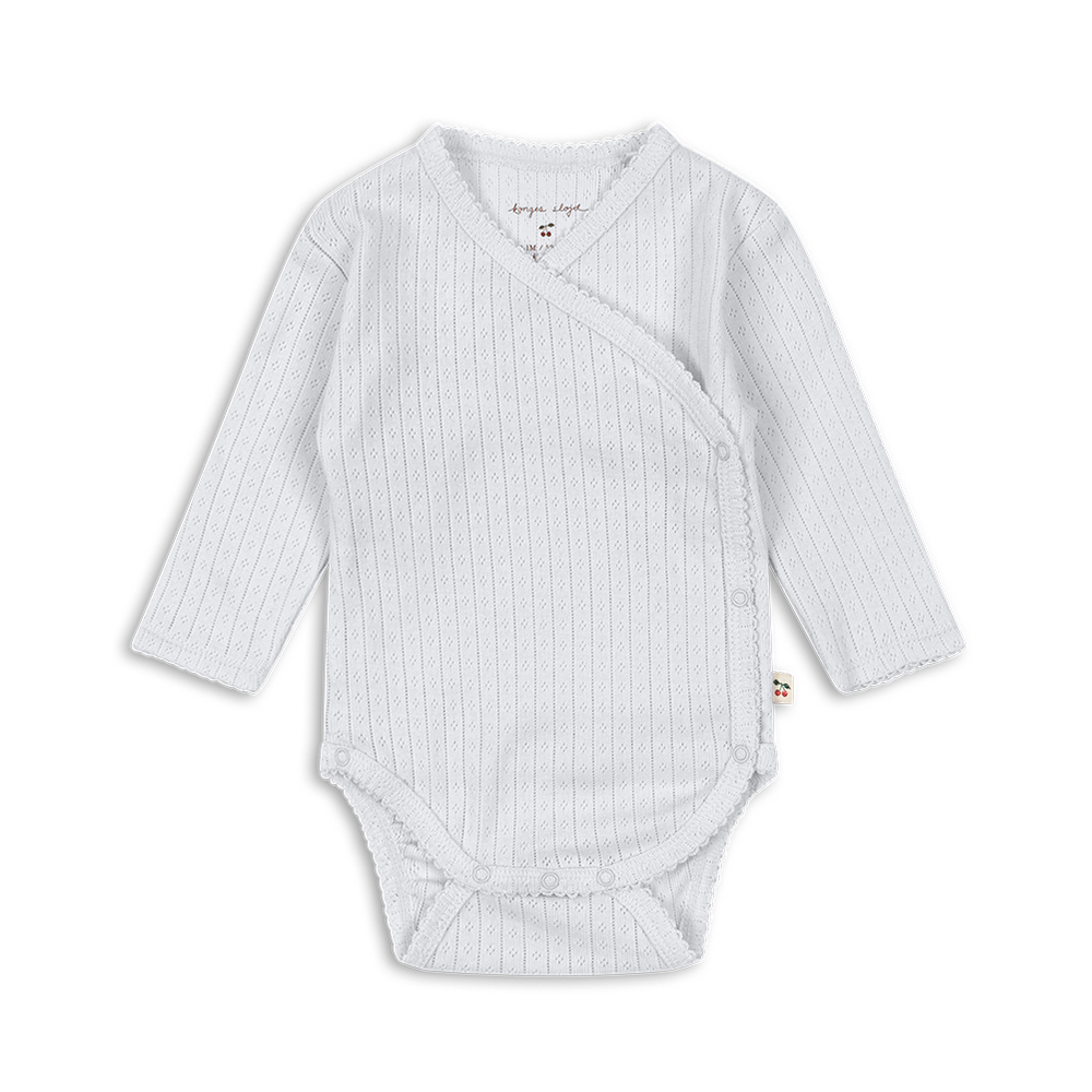 Bequemer Langarmbody in Grau und Pointellemuster von derdänischen Marke Konges Sløjd. Der Body ist aus weichster Bio-Baumwolleund dank der kleinen Druckknöpfe entlang des Körpers und im Schritt wird das Wickeln sowie An- und Ausziehen zum Kinderspiel.
