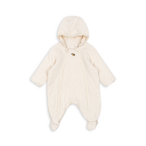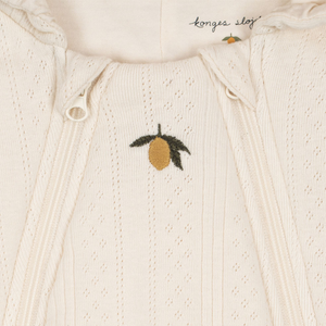 Schöner Onesie 'Minna' mit Kapuze und niedlichem Pointelle-Strickmuster von der dänischen Marke Konges Sløjd.Der Strampler besitzt ein weiches Material aus 100% Bio-Baumwolle und Umschlagklappen an Füsschen, damit diese schön warm bleiben. Die Kapuze schützt den kleinen Kopf vor Wärmeverlust. Dank der beiden Reissverschlüsse, die entlang des Körpers platziert sind, wird das An- und Ausziehen zum Kinderspiel.