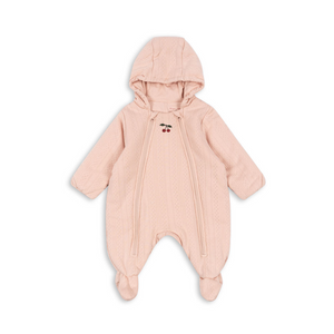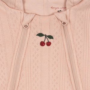Schöner Onesie 'Minna' mit Kapuze und niedlichem Pointelle-Strickmuster von der dänischen Marke Konges Sløjd.Der Strampler besitzt ein weiches Material aus 100% Baumwolle und Umschlagklappen an Füsschen, damit diese schön warm bleiben. Die Kapuze schützt den kleinen Kopf vor Wärmeverlust. Dank der beiden Reissverschlüsse, die entlang des Körpers platziert sind, wird das An- und Ausziehen zum Kinderspiel.