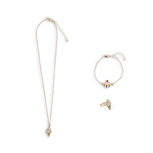 Das zauberhafte Schmuckset 'Sweat' von Konges Sløjd besteht aus einer Halskette, einem Armband und einem verstellbaren Fingerring. Jedes Schmuckstück ist mit einem liebevollen Motivverziert und gibt dem Outfit von kleinen Prinzessinnen den letzten Schliff. Das Set wird in einer schönen Box geliefert, was es zum perfekten Geschenk macht.