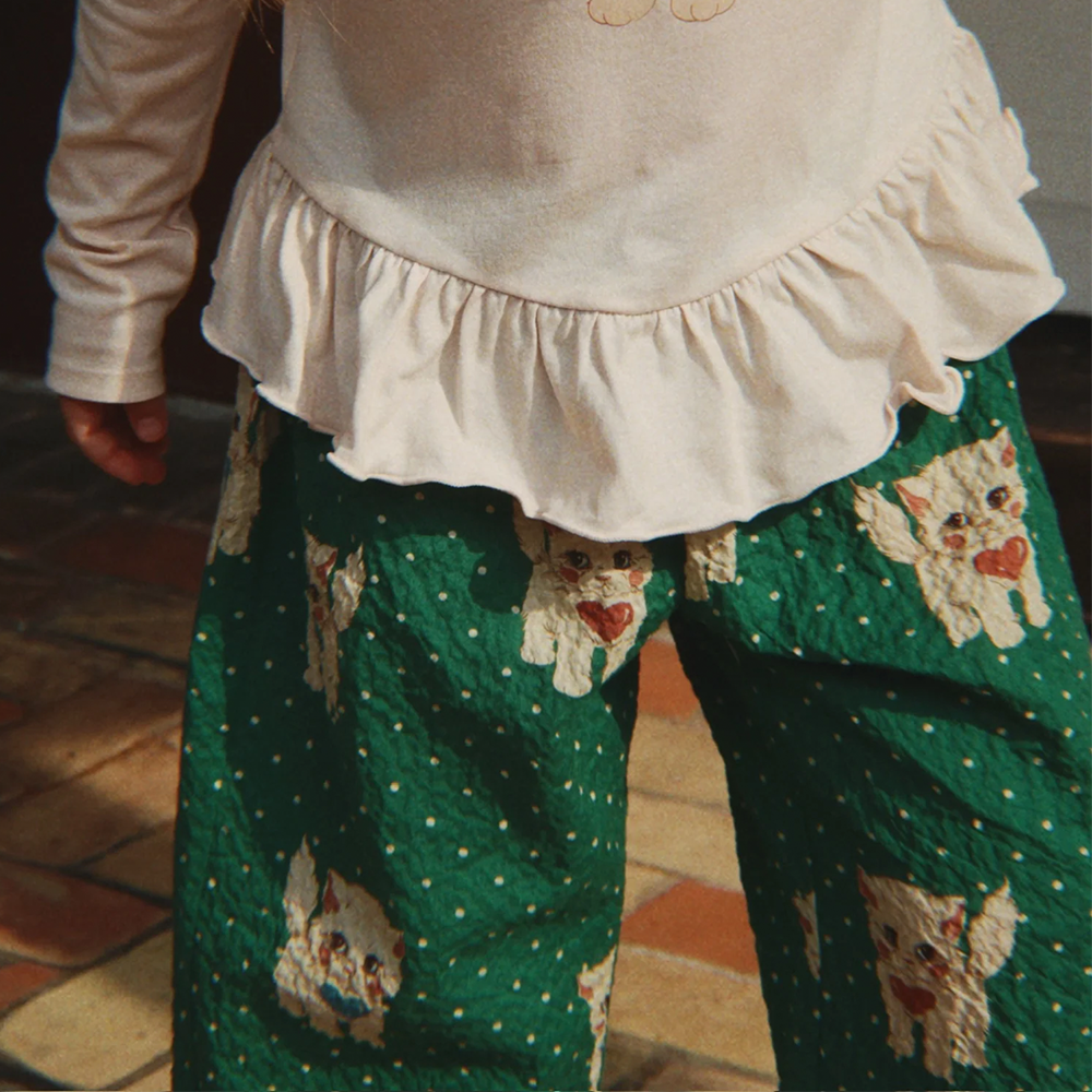 Lässige Seersucker Hose 'Elin' aus weicher Bio-Baumwolle mit verspieltem Katzenmuster von der dänischen Marke Konges Sløjd.