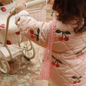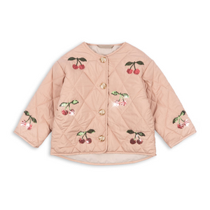 Die schöne Steppjacke 'Flora' von Konges Sløjd in Rosa ist mit hübschen Kirschen aus Pailletten dekoriert und hält dein Kind an Frühlingstagen Tagen angenehm warm. Die Jacke ist leicht wattiert, besitzt einen lockeren Schnitt und wird mit Knöpfen geschlossen.