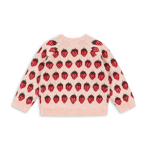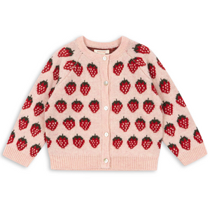 Die weiche Strickjacke 'Belou' von Konges Sløjd mit hübschem Erdbeermuster ist ein Klassiker für die Übergangszeit. Sie ist aus einer weichen Wollmischung gefertigt und wird mit schönen Knöpfen geschlossen. Der Cardigan kann alleine getragen werden oder an besonders kalten Tagen als zusätzlich wärmende Schicht unter der Jacke.