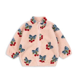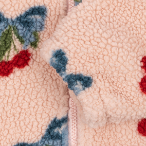 Teddystoff gefertigt und besitzt ein verspieltes Herzchenmuster. Die Jacke schliesst mit einem Reissverschluss, hat elastische Bündchen, einen hohen Kragen und Seitentaschen.