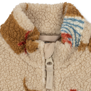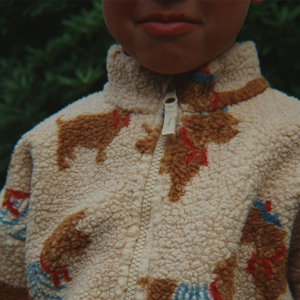 Die kuschelige Plüschjacke von Konges Sløjdist der ideale Begleiter für kühle Tage. Sie ist aus weichem Teddystoff gefertigt und besitzt ein verspieltes Hundemuster. Die Jacke schliesst mit einem Reissverschluss, hat elastische Bündchen, einen hohen Kragen und Seitentaschen.
