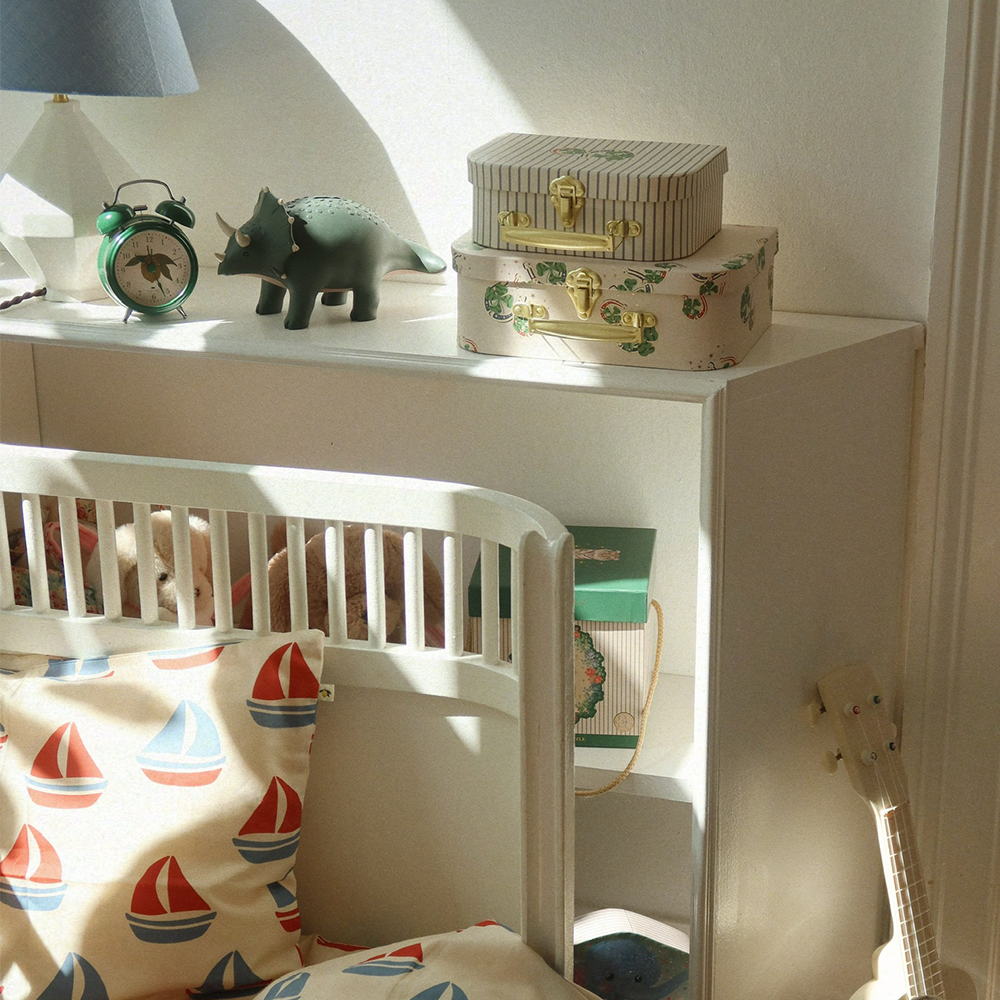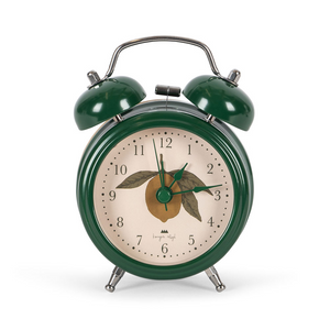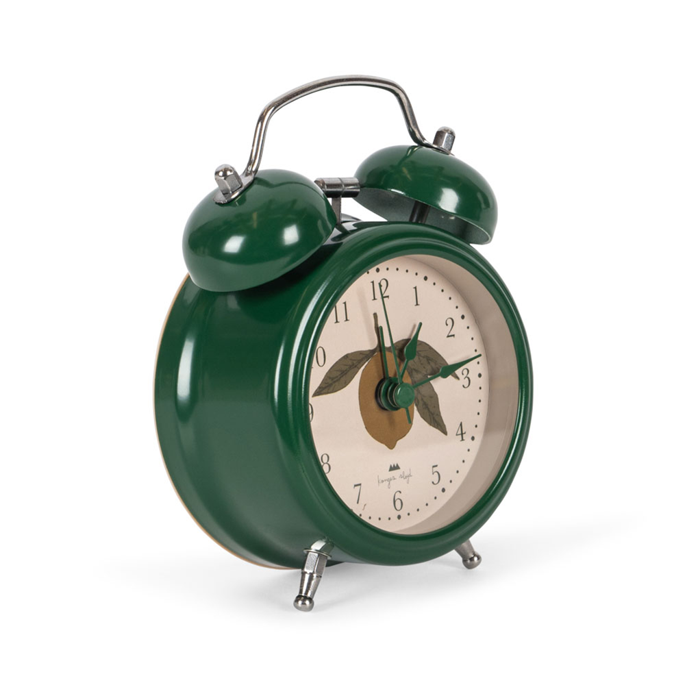 Der grüne Wecker mit entzückendem Zitronenprint von Konges Sløjd hilft Kindern spielerisch Verantwortung zu übernehmen und unterstützt sie bei der Morgenroutine.