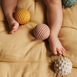 Die fünf weichen Sensorikbälle von Liewood laden Babys und Kleinkinder zum Entdecken, Fühlen und Spielen ein. Jeder Ball besteht aus weichem, flexiblem Silikon und besitzt eine eigene spannende Oberfläche, die zum Drücken, Rollen und Erkunden anregt. Durch ihre handliche Grösse lassen sich die Bälle besonders leicht von kleinen Händen greifen und halten. Beim Spielen werden ganz nebenbei die Feinmotorik sowie die Hand-Augen-Koordination gefördert. Gleichzeitig eignen sich die weichen Silikonbälle ideal als Beissring während der Zahnungsphase.