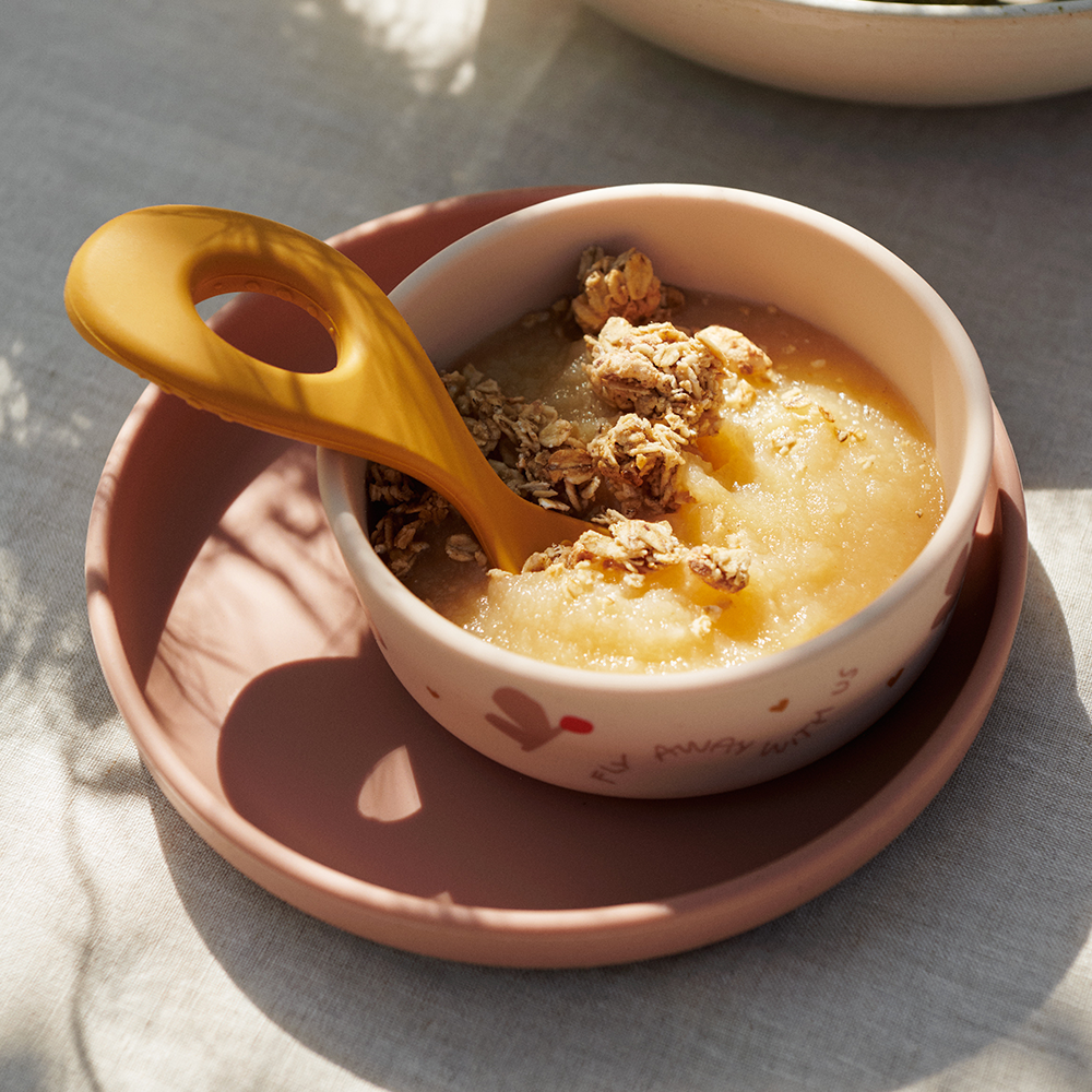 Mit dem rosa Baby-Geschirrset 'Vivi' mit süssen Schmetterlingen von Liewood macht das Essen noch mehr Spass.