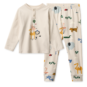Weicher Schlafanzug 'Wilhelm' von Liewood mit süssen Tiermotiven. Die Nachtwäsche ist ideal für Kinder: sie ist bequem, praktisch und bei 30 Grad waschbar. Der kleine Elastan Anteil sorgt für die ideale Passform. Für ein einfaches An- und Ausziehen ist das Oberteil mit Druckknöpfen ausgestattet. Der Pyjama ist aus 95% Bio-Baumwolle und 5% Elastan, welcher für einen Hauch von Stretch sorgt, gefertigt.