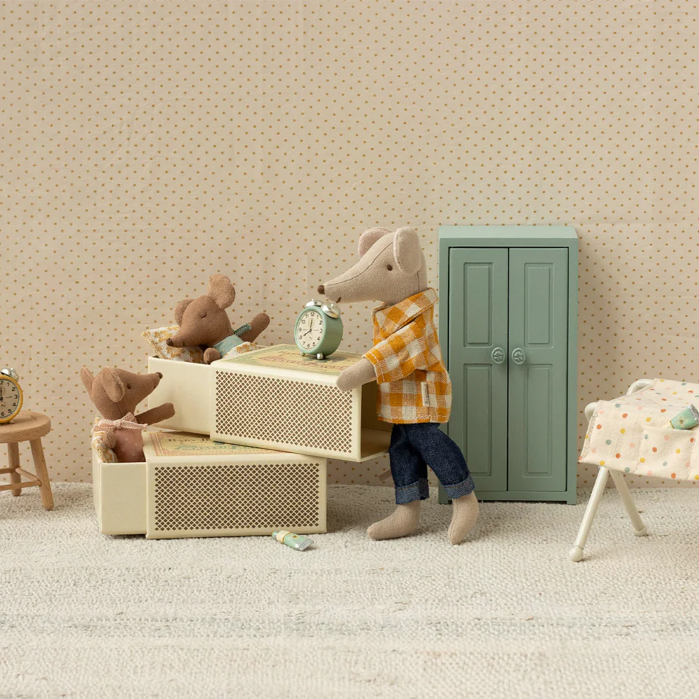 In dieser süssen, kleinen Streichholzschachtel steckt die Babymaus 'Sleepy Wakey' von Maileg. Kuschelig auf einer Decke gebettet, liegt sie im weichen Streicholzschachtelbettchen mit gemütlicher Decke und Kissen. Die Babymaus trägt ein süsser Schlafanzug und ein Schleifchen um den Hals.
