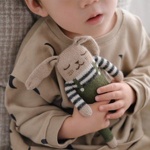 Der charmante Hase mit grüner Latzhose von Main Sauvage x Organic Zoo begleitet dein Kind ab dem ersten Tag. Er ist ein geduldiger Spielkamerad, ein weicher Kuschelfreund und ein behutsamer Tröster, wenn einmal ein Tränchen fallen sollte. Der Kuscheltier-Hase wurde in liebevoller Handarbeit aus weichster Baby-Alpaka-Wolle gestrickt. Das macht ihn besonders sanft zur Babyhaut, hypoallergen und antibakteriell.