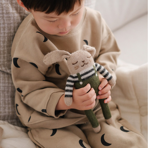 Die süsse Hasen-Puppe aus Alpaka Wolle von Main Sauvage wurde in Zusammenarbeit mit der beliebten Kinderkleidermarke Organic Zoo entworfen und liebevoll von Hand gestrickt.