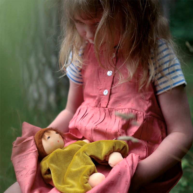Die niedliche Schmusepuppe 'Eichenkind' von Nanchen ist eine treue Begleiterin. Die kuschelig weiche Puppe regt zu ersten Rollenspielen an, ist eine treue Begleiterin beim Einschlafen und spendet Trost, falls einmal Tränen gibt. Aus weichstem Bio-Baumwollstoff in Handarbeit gefertigt, mit Deutscher Bioland Schafschurwolle gefüllt und liebevoll von Hand bemalt, vereint sie natürliche Materialien mit traditioneller Handwerkskunst. Mit ihrem schlichten, zeitlosen Design ist die Nanchen-Puppe nicht nur eine wundervolle Spielgefährtin, sondern auch ein besonders schönes Geschenk.