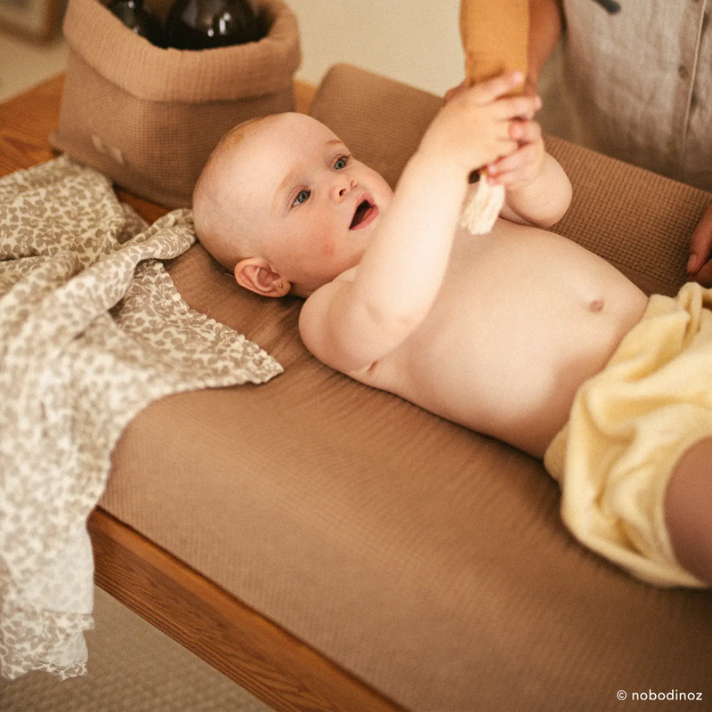 Super weicher Bezug für das Wickelkissen von Nobodinoz. Der Wickelkissenbezug besteht aus gemütlicher Bio-Baumwolle in einer angenehmen Wabenstruktur. Das doppelte Baumwoll-Musselin ist weich und bequem, ideal für die zarte Babyhaut. Hergestellt in einer Produktionskette mit kurzen Wegen in Barcelona.