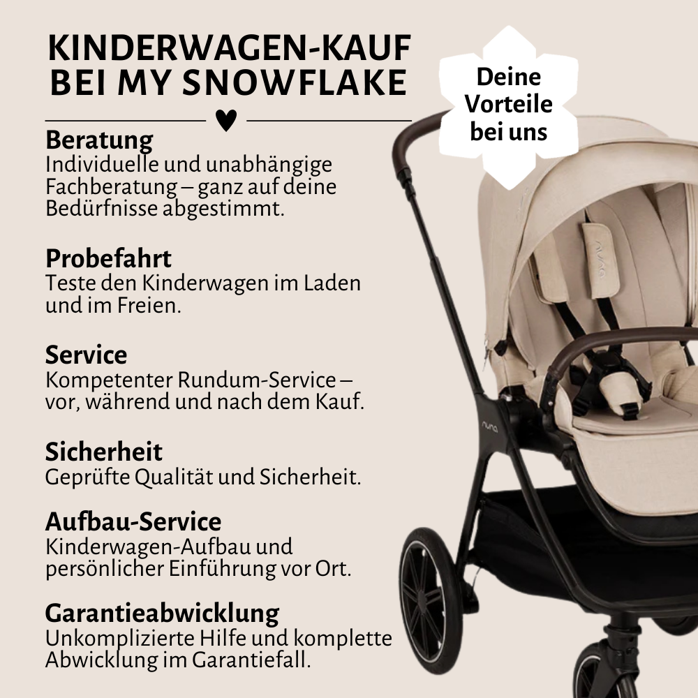 Das Triv lx von Nuna macht jeden Spaziergang zu einem besonderen Erlebnis – ganz egal, ob du durch die Stadt schlenderst oder auf schmalen Wegen unterwegs bist. Die grossen Räder in Kombination mit der Allradfederung ermöglichen dir eine sanfte Fahrt auf nahezu jedem Untergrund. Dank der mit Gummischaum gefüllten Reifen musst du dir keine Gedanken über Pannen machen. Der höhenverstellbare Schiebebügel sorgt dafür, dass Mama, Papa und andere Betreuungspersonen stets bequem schieben können.