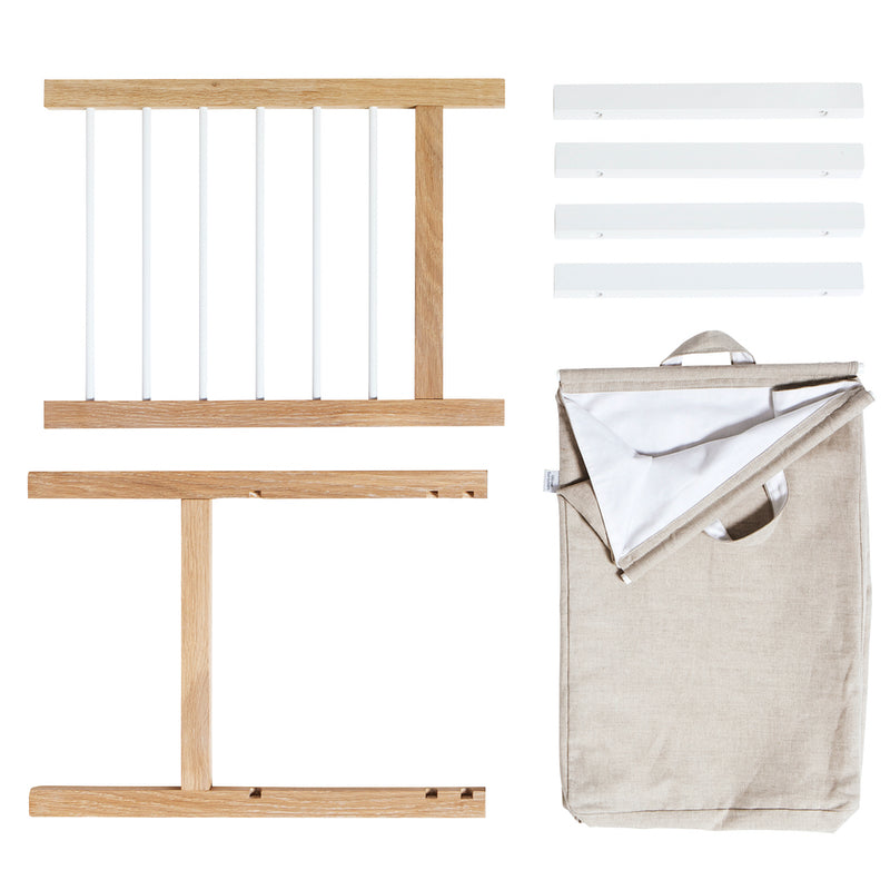 Bitte beachte: Die Seaside Wickelkommode kann mit zusätzlichen Auszügen (Produktnummer: 021330) ausgestattet werden, die unter der Topplatte integriert werden: Ein Auszug hat sechs Sprossen, an denen Dinge aufgehängt oder mit Wäscheklammern angebracht werden können (10 Wäscheklammern inklusive), der andere ist als Halterung für den Wäschesack vorgesehen.