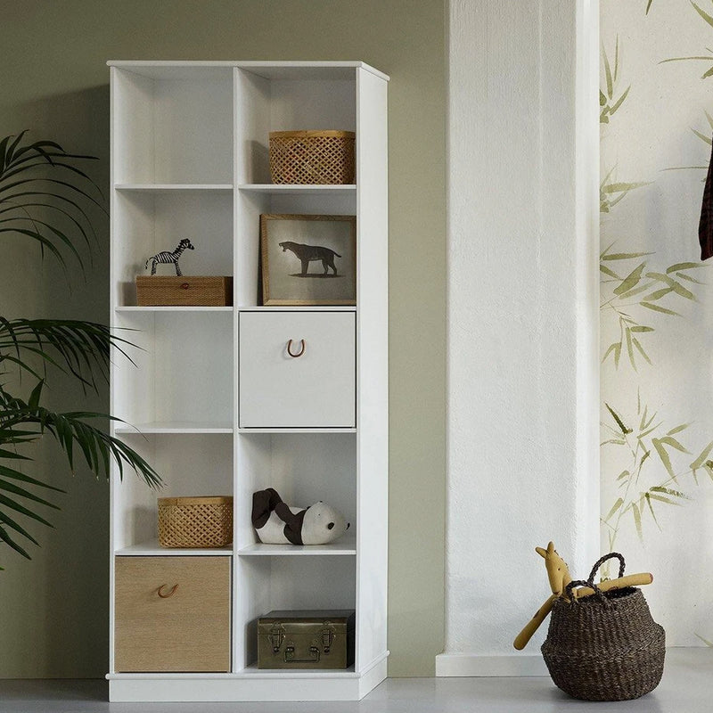 Die Aufbewahrungskisten, die individuell in die Regalfächer gestellt werden können, sind 3-seitig weiss und einseitig Eiche im typischen Stil von Oliver Furniture. Sie können so mit der weissen oder der Eiche Seite lose eingeschoben werden. Beide Seiten haben eine hochwertigen Lederschlaufe als Griff.
