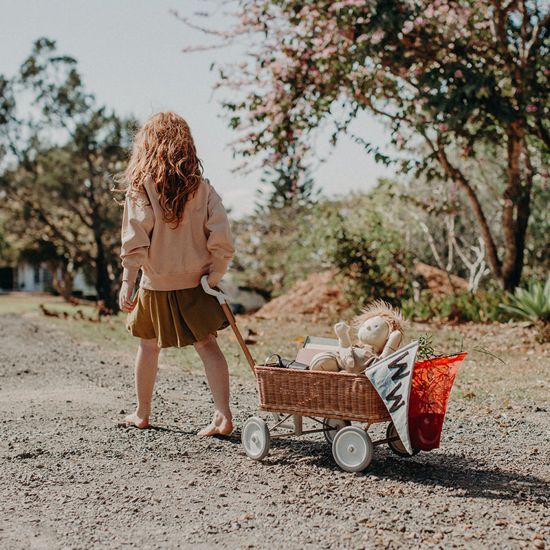 Der Puppenwagen aus Rattan von Olli Ella ist ein Verwandlungskünstler. Denn im Handumdrehen wird aus dem kleinen Kinderwagen ein Einkaufs-Trolley.