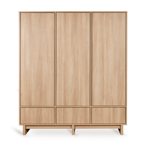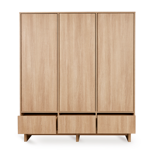 Der schöne Schrank XL 'Kyo' von Quax in Honey Ash schafft mit seinem warmen Holzton eine Atmosphäre von Ruhe. Der dreitürige Schrank bietet dank flexibel anpassbare Regalböden und Kleiderstangen sowie 3 Schubladen grosszügigen Stauraum für Kleidung, Spielsachen und Bastelutensilien. Die drei Türen mit versteckten Griffen lassen sich durch Soft-Close System geräuschlos mit einem sanften Druck öffnen und schliessen. Der Kleiderschrank fügt sich harmonisch in jedes Kinder- oder Babyzimmer und sogar ins Elternzimmer ein.