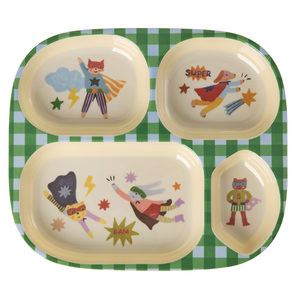 Hübscher Melamin-Teller 'Hero' in Grün mit heldenhaften Motiven und mit 4er-Einteilung von Rice.