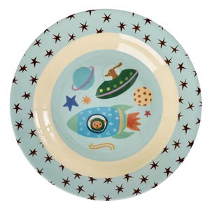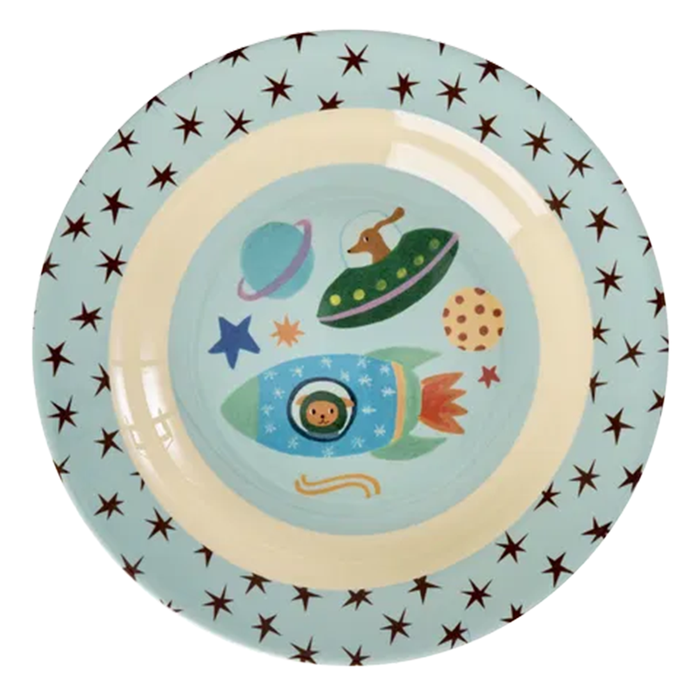 Tiefer Kinderteller 'Dogs in Space' aus Melamin mit verspielten Weltraummotiven von Rice.