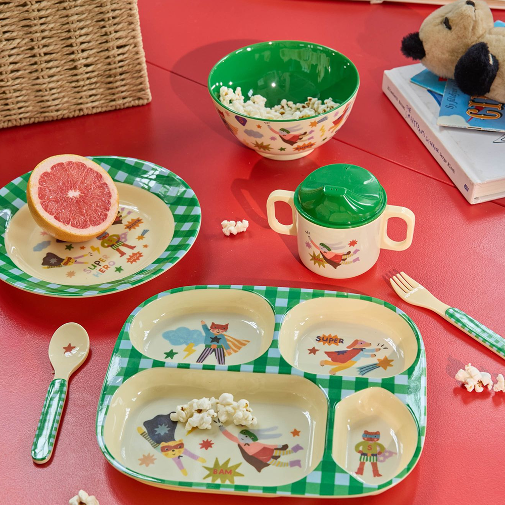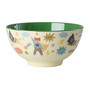 Schüssel aus Melamin mit verspielten Superheldenmotiven von Rice.