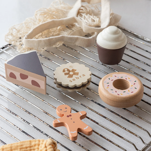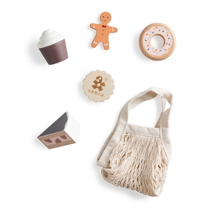 Das schöne Kuchen- und Kekseset aus Holz mit liebevollen, aufgemalten Details von Sebra passt perfekt in den Kaufmannsladen oder in die Spielküche. Es besteht aus einem Donut, einem Cupcake, einem Schokoladenkeks, einem Stück Kuchen und einem Lebkuchenmann. Dein Kind kann dabei in verschiedene Rollen schlüpfen, sei es beim Servieren, Kochen oder Picknicken. Die Lebensmittel sind in einem charmanten, gehäkelten Einkaufsnetz im französischen Stil verpackt.