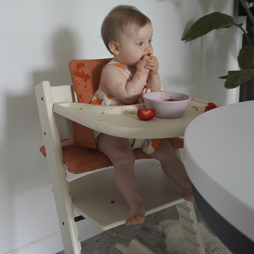 Der bekannte Tripp Trapp® Stuhl aus Buche in Vanilla White von Stokke® bringt Familien vom ersten Tag an zusammen an einen Tisch.